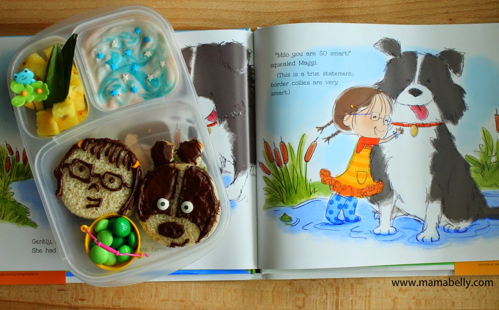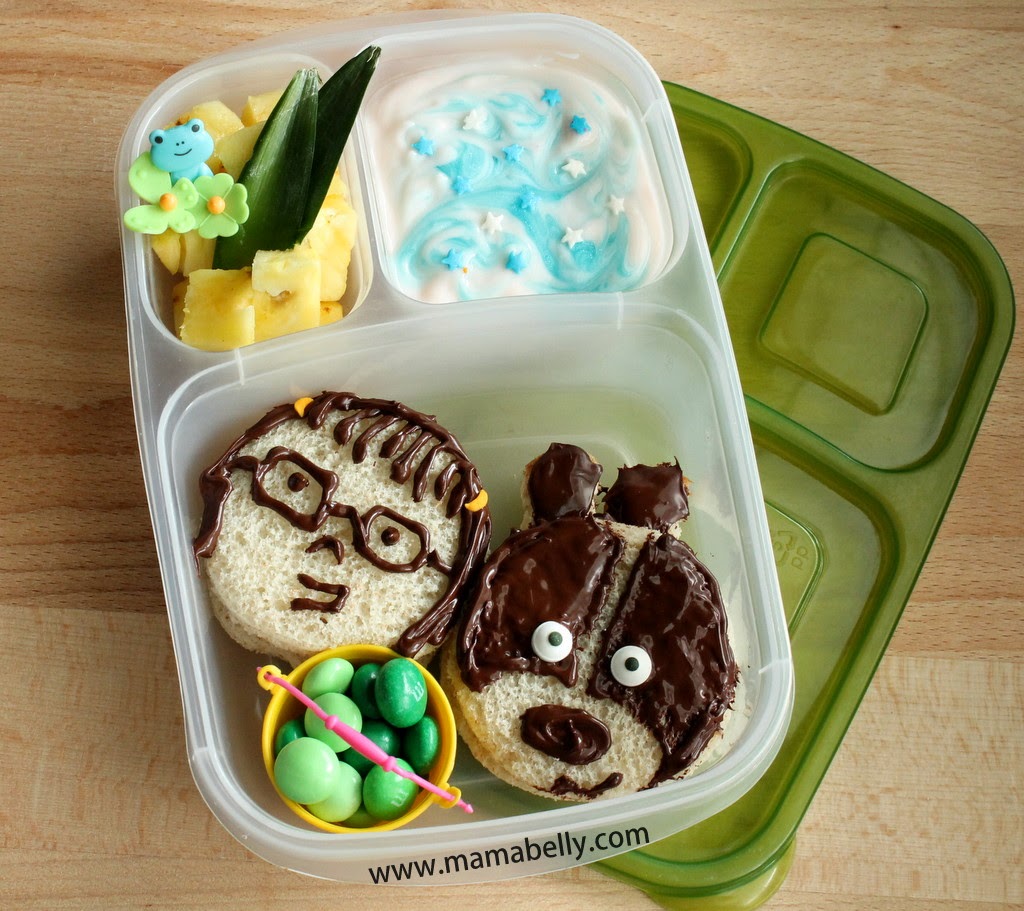 Mamabelly's Lunches with Love. She packed it with:a little frog hiding in pineapple leaves and pineapplestrawberry yogurt with blue glitter swirls and polka dots (just like Maggi's new boots)a bucket for the frog filled with green frog bait (Nina's kids thought green mint M&Ms would work)and of course, Maggi and Milo's peanut butter sandwiches decorated with dark chocolate!