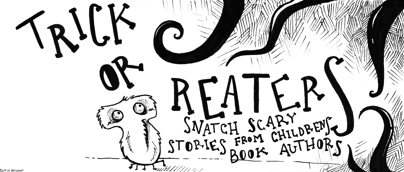 KC: The name? It is the phrase “Trick or Treaters” being attacked by monsters. What? Yes, in each manifestation of the logo, a creature is stealing the second T, changing "treaters" to "reaters." In one version the “T” itself is an adorable fuzzy monster fleeing a many tentacled beast. "Reaters" is "readers" in my kidlit-crazy imagination.