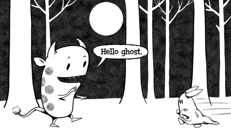 Picture book author/illustrator Kevan Atteberry, creator of Declan, the rather lovable monster in Bunnies! and Puddles! (HarperCollins), has created original sequential art that tells a brand new story about the master and his pastel bunny friends. This has a Scare-o-Meter rating of 1, but a laugh that will be decimals higher.