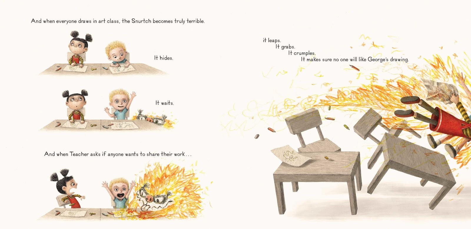 Every child (at any age!) will recognize Ruthie's Snurtch, and feel comforted that they are not alone in having an all-too-mischievous side. Ruthie's solution (to draw her Snurtch and share it with others) is both a brilliant coping mechanism and a super-fun story time activity.