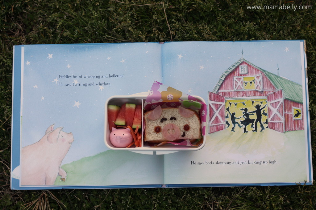 Nina from Mamabelly.com packed a pig-tastic lunch you can eat while dancing:watermelon fresh from the farmmini carrotsa treat in a cute pig box and a Peddles ham sandwich with ham and ketchup decorations