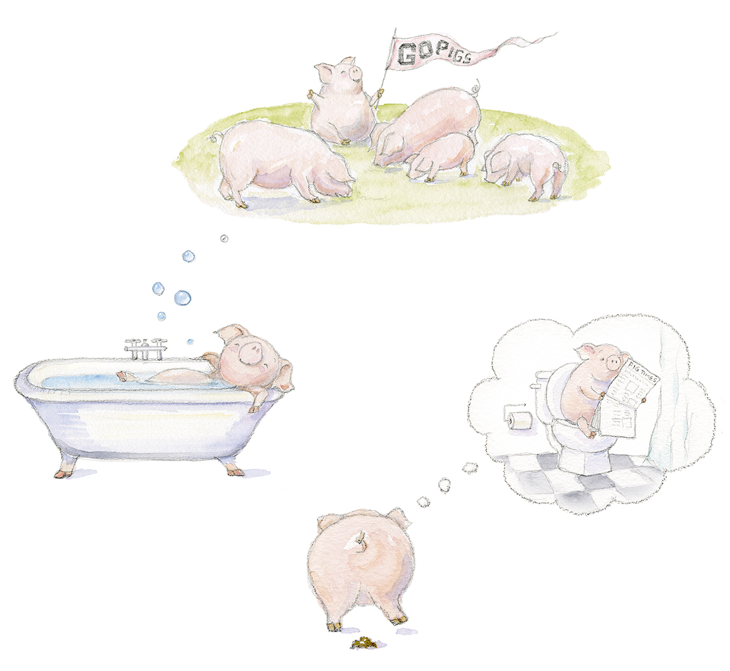 PEDDLES: Wellll— it’s all in the book, and it goes kind of like this: First, I’d skip out on naptime and have some pizza. Then I’d go to the game and do some rooting for Team Pig, then I’d come back for a little time alone in the loo for a nice bath and well, you know, I’d have to go . . . and read the paper. Like I said, it’s all in the book.