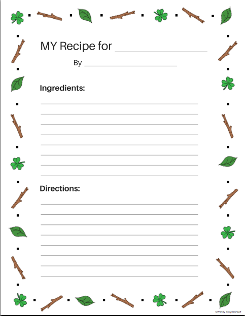 Another variation is to make a collage. Give students a piece of construction paper. Have them draw some sort of container for their “pretend recipe” and then have them cut and paste items in it (dried pasta, buttons, string, scrap paper, magazine pictures, leaves, twigs). Children can write their own recipe or dictate their recipe to an adult.