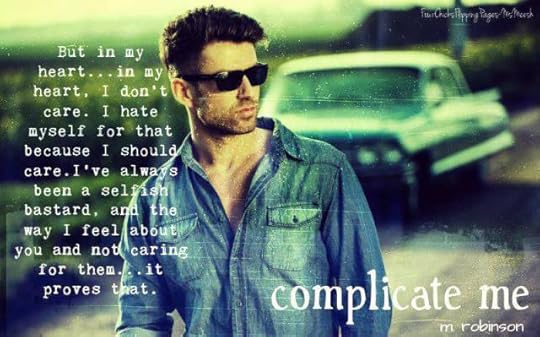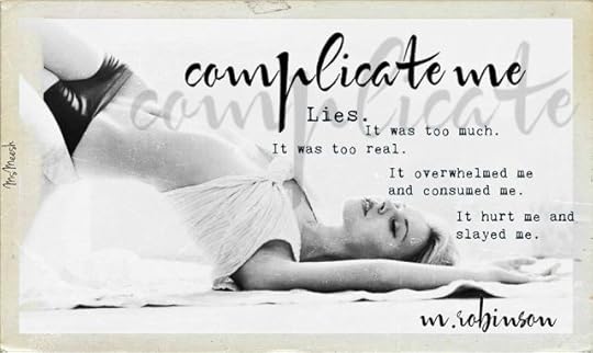 I didn’t know what to expect going in to read Complicate Me. I’ve enjoyed every other book from Mrs. Robinson so I went into this one with an open mind although I hate contemporary romance with a passion. With that being said the dynamic between Alex and Lucas kept you on your toes waiting with fear on where their lives will lead them. I can say I was angry with most of their family and friends for more than half of the book. I think they had a lot to do with some of the hurt and pain Alex and Lucas went through. The prologue was very, very good and sucked you in right off the bat. The rest was a bumpy ride and at times I wasn’t sure what the outcome would be. You found yourself saying, “how many ups and downs can one couple go through before it’s no longer worth it?”