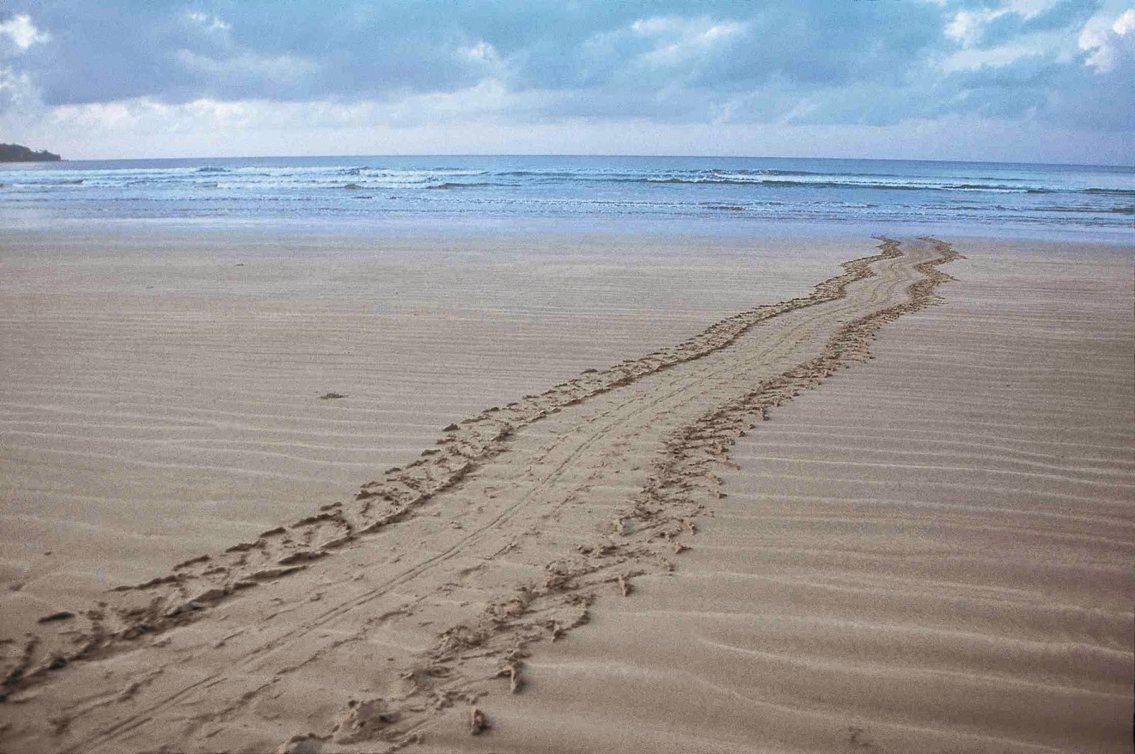 The Giant Leatherback leaves behind her flipper marks as she returns to the ocean after nesting