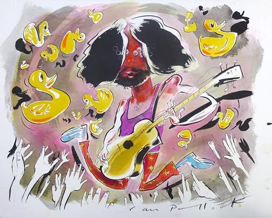 Again, Ian’s picture shows Steve, very much in his element, again with several sets of eyes, surrounded by rubber ducks, in a pair of red satin trousers with yellow stars, which I’d described in the text.