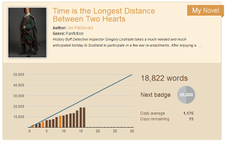 My NaNoWriMo project is coming along nicely. I'm enjoying the story and rediscovering my joy in writing. I've just over 11K words, though I'm not keeping up with the recommended daily word count and was never aiming for the 50K word goal. Could I do it? Perhaps with a bit more prepping before hand. But I've found that knowing too much about what happens makes me not want to write it.