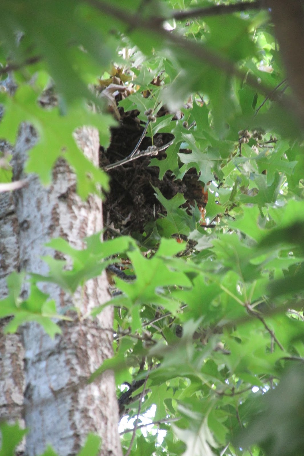 Along with not talking about the yard much, I haven't mentioned my backyard babies much either. I was pleased to discover that I in fact have a squirrel nest in one of my trees!