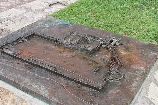 This is the iconic image everyone expects and thinks of when one mentions The Alamo, but the fort itself was a much larger thing.Here's a model of the actual fort in brass. The structure in the above pic looks to be located in the middle-ish of the outpost.