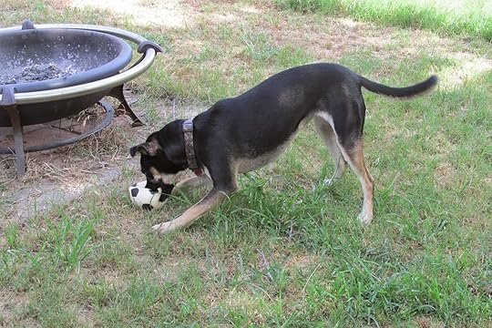 She loves to play and we step outside several times in the course of a day to throw her ball. Though not the one pictured. Her preferred ball is a football shaped tennis ball, at the moment.