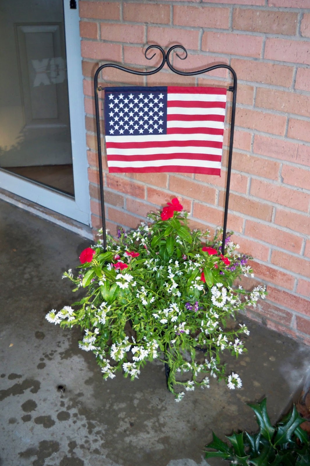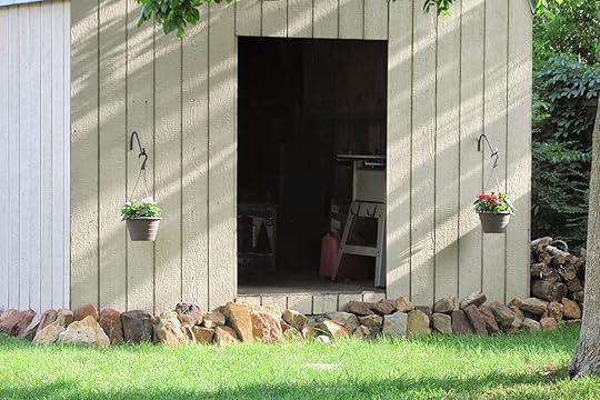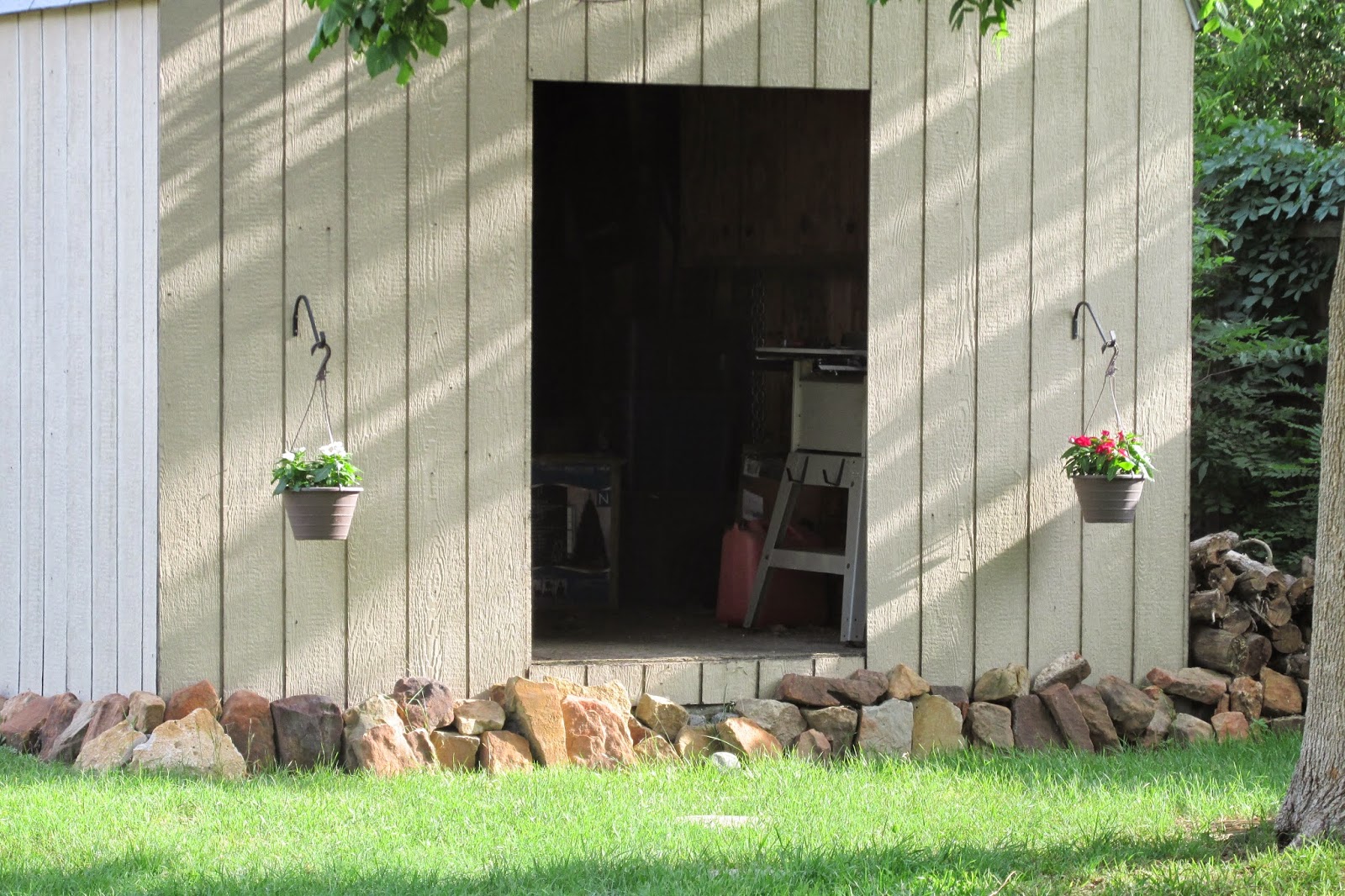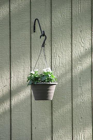I screwed the two hooks to the shed to hang my two new hanging baskets......one white (below) and one red vinca.