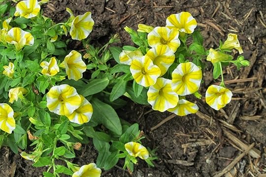 That's blue lobelia in the center with white vinca and red petunias alternating around it. What do you think?I also had plant my lemon slice super bells...