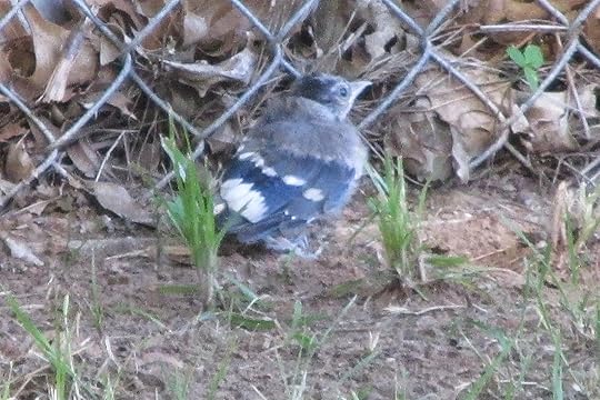 A short time later, Sonshine looked out the kitchen window to see baby blue jay doing a hopping roll in the direction of his parents' encouraging calls. Eventually he made it through the chain link fence and under the neighbor's privacy fence. I hope he made it made safely back to his nest.
