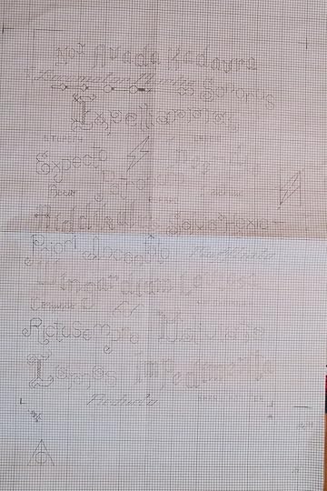 Anyway, once I picked out alphabets in fonts I liked, then I had to create the words from the tee shirt to see how they scaled and mixed and matched. Different fonts are going to end up different sizes. Once I did that and counted the sizes of the words, I had to arrange them on my master pattern. I started with the arrangement found on the tee shirt, but had to move things around to make them fit and look appealing. I ended up looking up a few spells that weren't on the tee to switch out or add into available spaces.