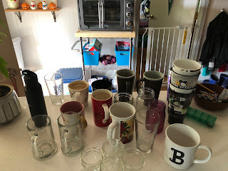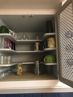 Now this past weekend, I worked on the glass / mug cabinet, the bathroom towel cabinet, and the food storage container cabinet. That's by grouping: mugs vs. travel mugs vs. canning jars.