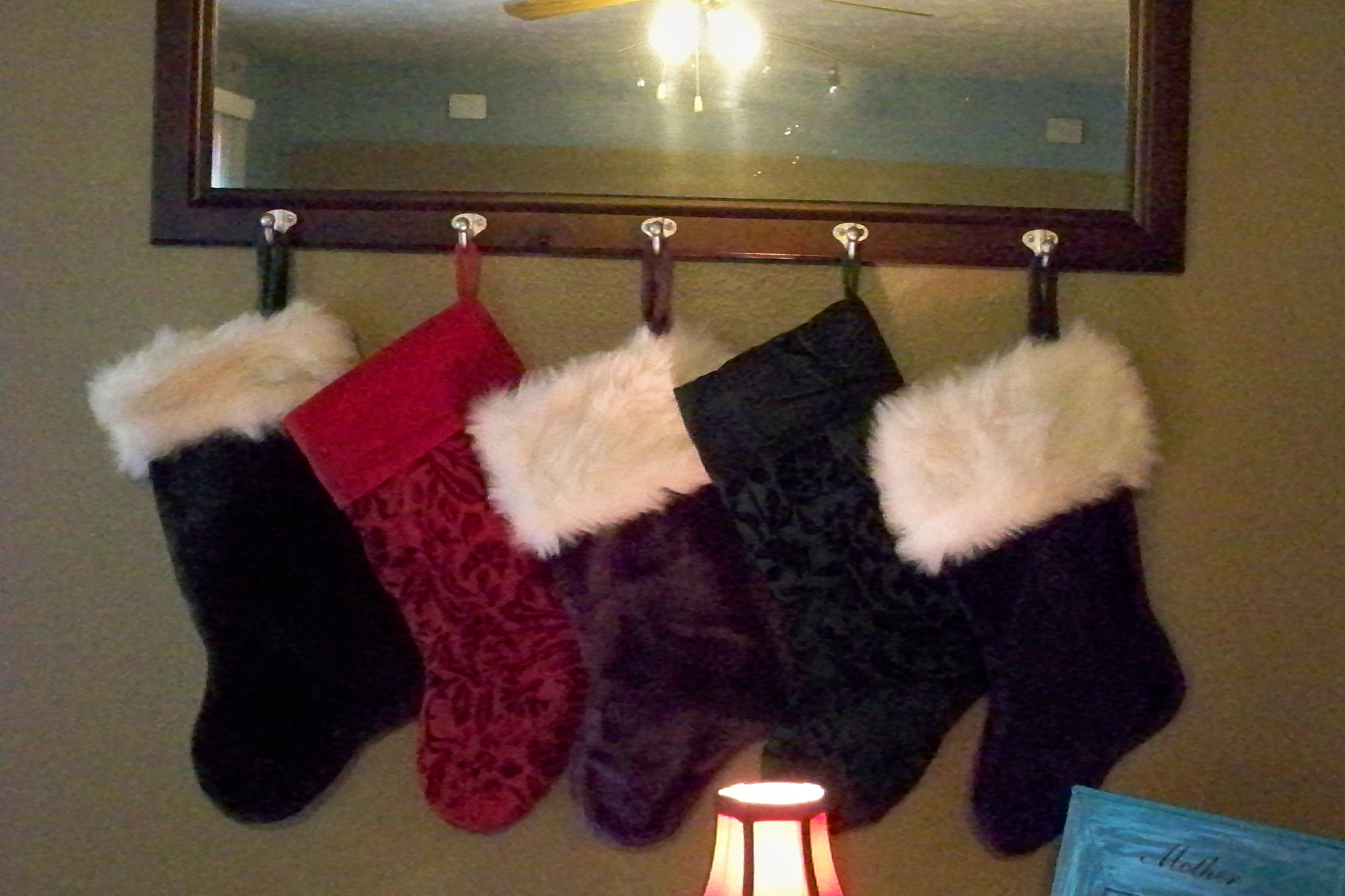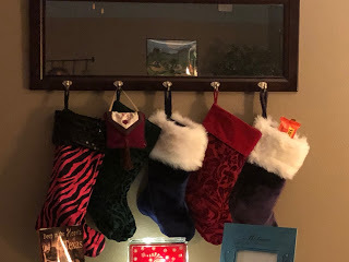 I must confess that a) they've been hanging there all year because I forgot to pack them away last year, and b) I hadn't planned on stuffing them this year. Mostly we end up with a bunch of candy that everyone gripes they shouldn't eat. But as I planned this post, I had an idea and so now...they have a few goodies, but are not stuffed to the fluffy trim.