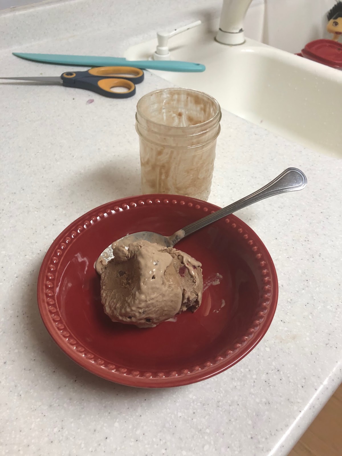 The recipe makes a bit more, but I'd nibbled a bit before remembering to take a picture. :0) Add all ingredients to a mason jar, shake for five minutes, then freeze until done. Easy peasy.