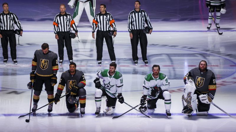 Kneeling: Ryan Reaves, Jason Dickinson, Tyler Seguin, and Robin LehnerThese four players are the first to take a knee during the American and Canadian national anthems prior to a game in which they were playing. Matt Dumba took a knee at a game a few days prior to this, but he'd given a speech and was not playing in the game itself. Please note that Matt Dumba and Ryan Reaves are players of color.