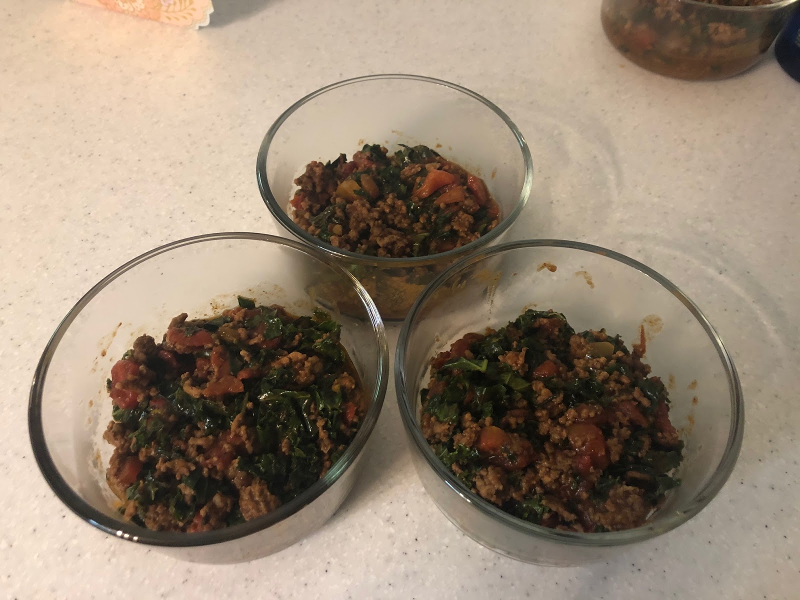 So I thought--I'm in Texas and beanless chili is a thing. But what could I add to add some bulk--as if beef wasn't enough--and I decided on kale. Of course, you have to enjoy kale for this to work, which I do, so I was off to the races. I bought a package of chili seasoning because I'm not good with that kind of thing and instead of plain old diced tomatoes, I bought a can of Ro-tel for an added kick.