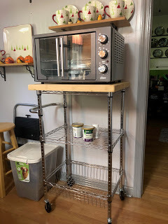 Several months ago, my mother-in-law gave me a wonderful counter-top oven. It works great and I love it. Thanks again, Mimi! But it has lived on my counter since then and it's the size of a large microwave. So between it and my actual microwave, well, the counters are full. And I just couldn't take it any longer, so I made a purchase yesterday. A kitchen cart to put this thing on. And it's awesome. The main part of the counters are now free off all the crap that had been conglomerating on it.