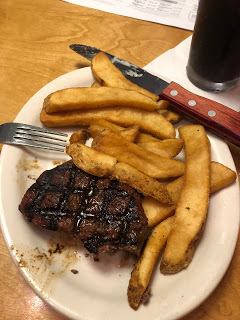 So, yes, I ate that pint of ice cream and the bag of licorice. I had one box of those yogurt covered cranberries and three pumpkin cupcakes with frosting. I also had a coffee thing from Starbucks and a steak lunch (below) courtesy of DD. It was a gluttonous day, but well worth it. I was back on the carb-fast wagon Monday morning however and will be going for three weeks this time. I've also added back in my targeted exercise routines.