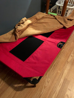 In a push to help Rayna's allergy situation and just because she needed new beds, she is now the proud(?) owner of three raised mesh/canvas beds. Now all the dander, dog hair, dirt, and / or bugs will fall to the floor rather than live and fester in the bedding. I can easily sweep / mop under her beds and throw the blankets I bought specifically for her in the wash.