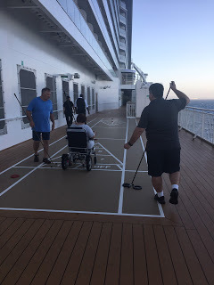 Playing shuffleboard one evening,even though none of us actually knew how to play.