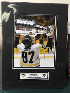 In case it's hard to tell, it's a matted collectible photo of Sidney Crosby--my absolute favorite player--three-time Stanley Cup champion, kissing the Stanley Cup in June of 2017. That was the second of back-to-back titles--the Penguins also won in 2016. That was the first time it'd happened since 1997/1998.