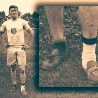 This is Jim Thorpe, first Native American to win a gold medal for the United States...He represented the U.S. in Track and Field in the 1912 Olympics. Look closely at the photo, you can see that he's wearing different socks and shoes. This wasn't a fashion statement.