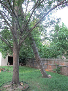 The dead tree fell over. It's been dead for a few years now, being held in place by the cable that serves--served--as a clothes line. Luckily for us, it fell into our other tree.