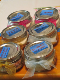 As for the busy...well, between wrapping presents (about halfway done) and writing, I've been making home-made bath products for my sisters-in-law. Chocolate, orange, and pumpkin spice. Don't those sound lovely? I tried out the orange bath salts last night myself and the bath was worth it for the smell alone! That whole endeavor would be even better if I liked taking baths more often, but I can barely stand to shower, much less soak. So I have to find a way to use up or give away whatever's left over.