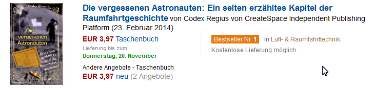 Bei Amazon war "Die Vergessenen Astronauten" gestern als "Bestseller Nr. 1" in der Abteilung "Luft- und Raumfahrt" ausgewiesen - vor Felix Baumgartner auf Platz 4! Heute hat es mit Baumgartners Buch die Plätze getauscht. Wie hast du das denn gemacht, Felix? *grins*