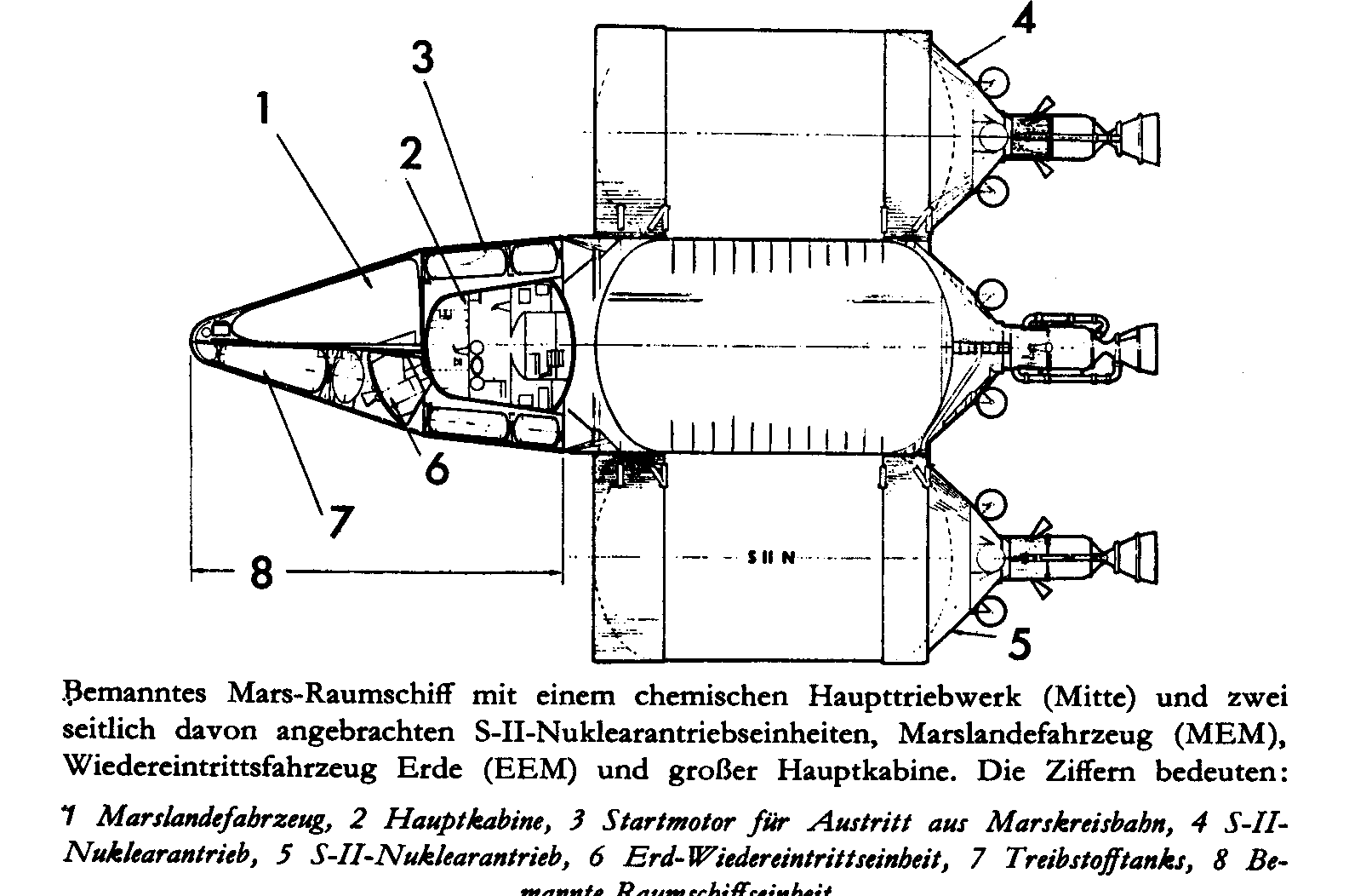 The unit is driven by a chemical reaction drive (3) flanked by two S II nuclear booster units (4, 5). It includes a MEM (Mars Excursion Module, 1), an EEM (Earth Entry Module, 6) and a huge main cabin (2) that constitute the manned unit (8), also containing a launch engine for the ascent from Mars (3) and propulsion tanks (7).