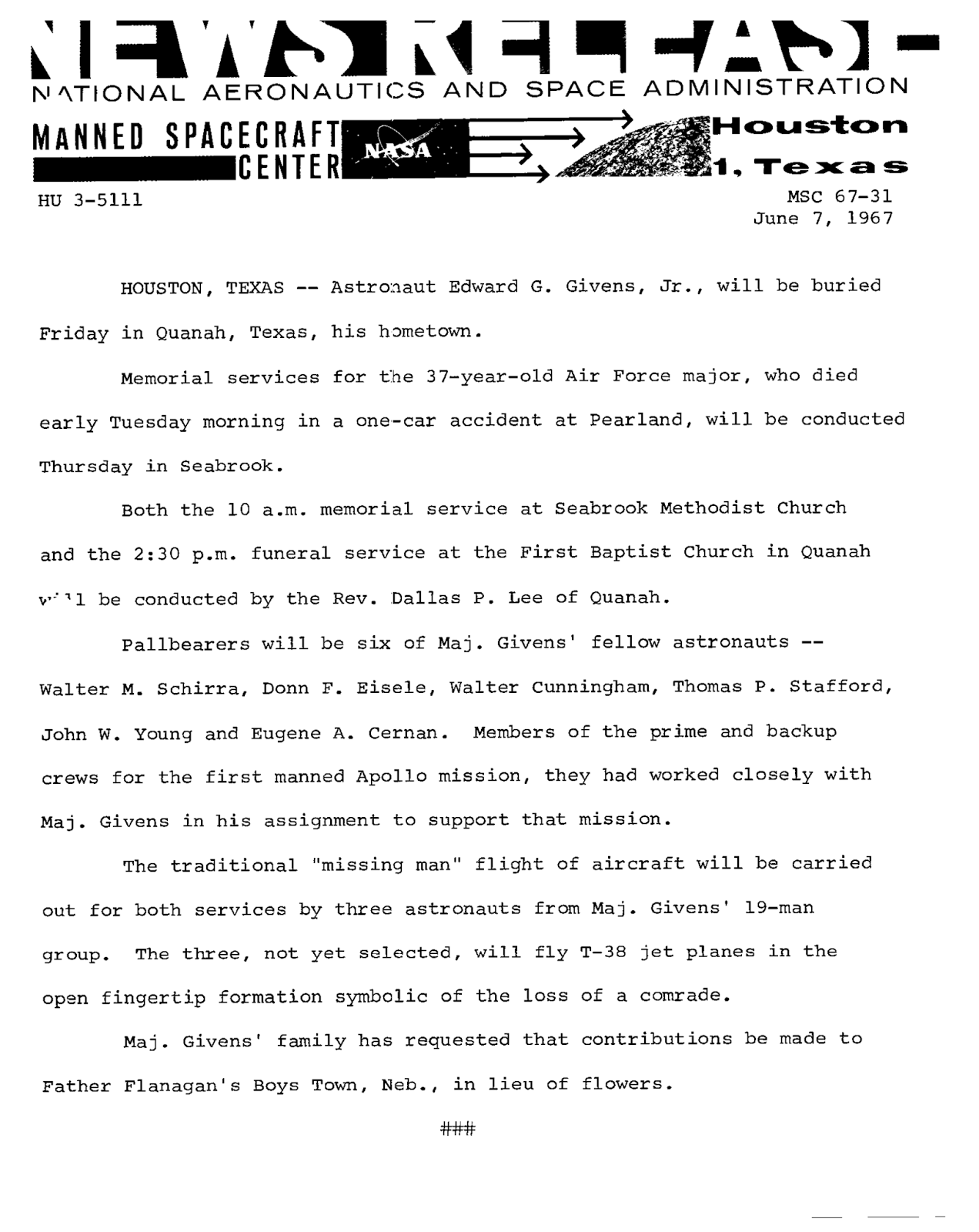 Dieses Blatt ist eine Pressemitteilung des Manned Spaceflight Centers aus dem Jahr 1967, in dem für heute vor fünfzig Jahren, Freitag, den 09. Juni, die Beerdigung des in einem Autounfall ums Leben gekommenen Edward Givens von der Astronautengruppe 3 angekündigt wird.Der Kartenausschnitt zeigt den Ort, an dem Ed Givens am 06. Juni 1967 eine scharfe Kurve übersehen hatte.