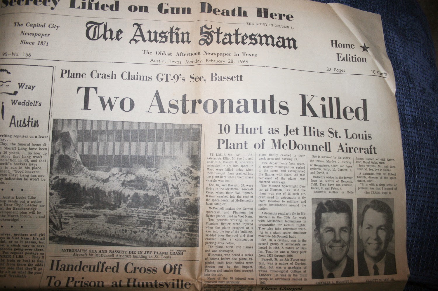 Zeitungsmeldung zum Absturz der Astronauten Elliot See und Charles Bassett am 28. Januar 1966 -
