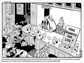 So, to stay PM and form a government that could work, May formed an alliance with the DUP, a party on pretty much no Englishman's radar. So newspaper political cartoons came out, and they have been ridiculously racist.