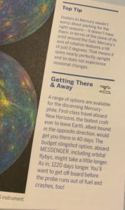 One of the fun things about this book is the humour. I get a little frisson of delight whenever I see the usual LP sidebar headings of ‘Getting There and Away’, ‘Top Tips’, ‘Five Facts’ and the Highlights, even for places like Neptune and Mars.