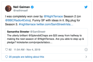 The Kickstarter for the third season of the brilliant radio SF comedy, Night Terrace, is entering its final third. In celebration, I’m interviewing a number of people involved with the previous two seasons and the current series!