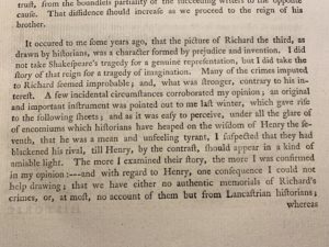 RichardThe first I looked at was a 1770 edition of Horace Walpole’s Historic Doubts on the Life and Reign of King Richard the Third, where he explores all the charges levelled against Richard Plantagenet by Shakespeare, Sir Thomas More and a host of other Tudor historians. He uses contemporary accounts and good old courtroom logic to unpack what appears to be a heap of fabrications, misreadings, malign interpretations and Tudor self-interest.