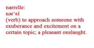 Seantheblogonaut said: To narrelle (v) – to approach someone with exuberance and excitement on a certain topic, a pleasant onslaught. He was narrelled into a corner, overcome by the young man’s exuberance.