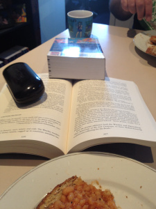I CAN READ YOU WHILE EATING. I can open you to a page and pick up my knife and fork and you will not flow determinedly shut from the force of your excellent binding. You will allow me to rend my eggs and bacon into bite-sized pieces and simultaneously get on with the awesomeness of the story I am currently so steeped in that frankly, it's lucky I remembered I need to eat. And I can change pages with a press of a button that only takes one finger! No more having to lay down arms, move the glasses case/travel guide/brick/cat I've been using to hold the pages down so I can either see the obscured paragraph or turn the page!