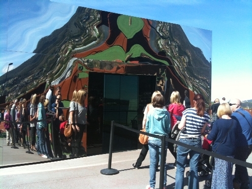 The gallery does not disappoint. We approached it by ferry from Hobart and climbed the stairs to the entrance. The gallery is set partially below ground, although one windowless wall faces the outside. The entrance is a building with a reflective surface and a tennis court, across which people stroll. A staff member says the tennis court was built there basically because Walsh likes to play tennis, and since he could build it, he did. It was at that point I realised that, in a fictional world, David Walsh would either be the eccentric billionaire who costumed up and fought crime by night, or he'd be the eccentric billionaire who will take over the world with his cunning technology unless James Bond can stop him in time. Not knowing the man, I figure he could go either way.
