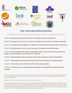 I know that some of the ideas on the list will not please all eating disorder advocates and treatment providers. That's unfortunate but also necessary. It is time to find and normalize some basic concepts. When a family seeks care for a loved one they deserve to see these nine facts reflected in the treatment they receive. Those looking to enter the field should be able to see these ideas reflected in their training. Policy-makers, too, should know that these facts are agreed upon by major eating disorder organizations and represent the cutting edge of thinking.