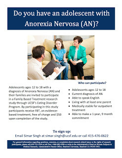 UCSF has a new treatment study examining the effectiveness of adaptive FBT for adolescent anorexia nervosa (ages 12-18 inclusive). For more information, contact Simar Singh at 415.476.0622, or simar.singh@ucsf.edu. You can also visit http://eatingdisorderprogram.ucsf.edu, or see flyer below.