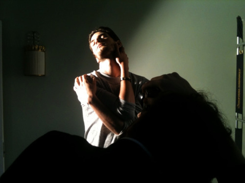 She turns her face slightly and looks up towards him. She nods and takes his left hand. She intertwines her fingers with his and moves his hand between her legs. She tightens her grip like a snare. Then she clenches her thighs and moves her back.