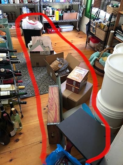 So here I am simply doing more to ensure that only pantry items remain here. To do this and avoid getting distracted, I require of myself that I not leave the room to put things in their new homes. My method (inspired by the Sidetracked Home Executives’ observations of their own distractibility that I’ve written about here) is to go ahead and allow things to pile up just outside the door or in this case, since just outside here is rather narrow, actually in the middle of the room!