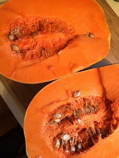 Normally I would cook the squash whole, but some of these are so big that they will have to be cut up. But truly, it’s much easier to cut and peel the squash after it’s baked! And the flesh when baked is nicely caramelized and non-watery, so I do recommend this method, even if you have to quarter it first.