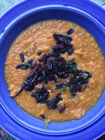 This time I also had beet greens I wanted to use, but I didn’t want to add them to the soup lest the color end up revolting. So I cooked those in oil and reduced with balsamic vinegar, adding some salt. It’s a nice garnish for a hearty dish!