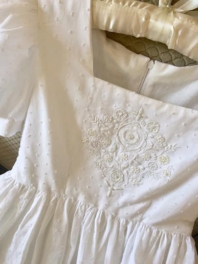 My granddaughter is making her First Holy Communion tomorrow, and Deirdre and I collaborated on her dress — I thought you would like to see it! I actually ordered the fabric in between taking Habou her broths and drinks and was able to start sewing two weeks ago.