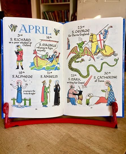 But now, I am thrilled to say, St. Augustine Academy Press has produced a nearly perfect new edition in hard cover, alleluia! (Follow the link to see the whole book and how well they reproduced the original.) My grandson has already absconded with my copy multiple times to pore over its beyond delightful illustrations. (That St. George, right?)
